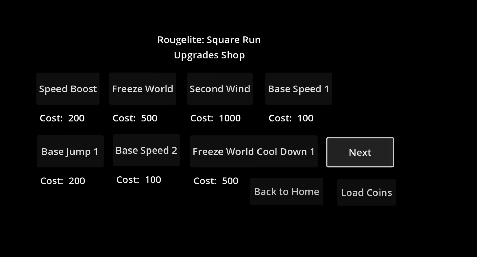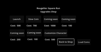 Roguelite: Square Run is a side scrolling game platformer where you collect coins while the platforms disappear behind you. You can purchase upgrades in the in-game shop to increase your jump height and base speed along with abilities to help you go further and increase your high score.